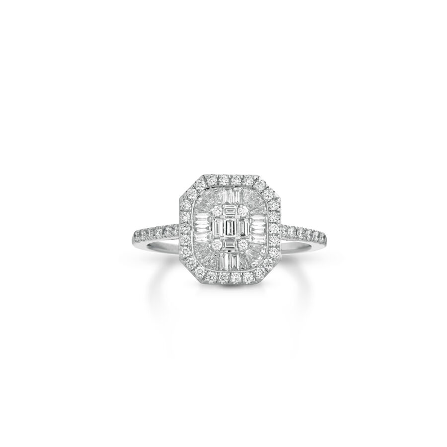 Anello in oro bianco 18 Kt con diamanti taglio brillante e taglio baguette