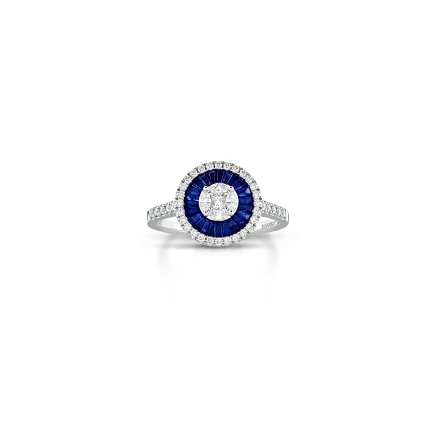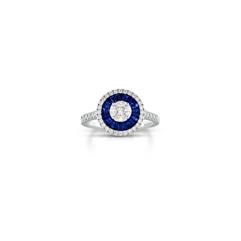 Anello in oro bianco 18 Kt con diamanti taglio brillante, taglio navette e taglio princess e zaffiri taglio baguette