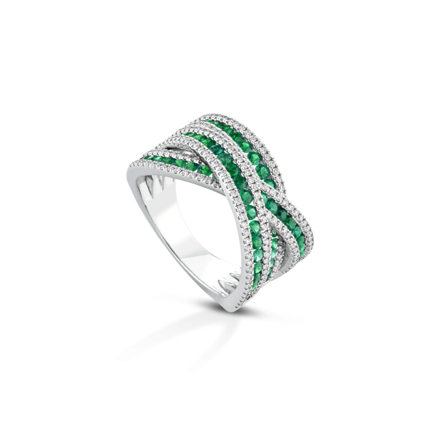 Anello in oro bianco 18 Kt con diamanti e smeraldi taglio brillante